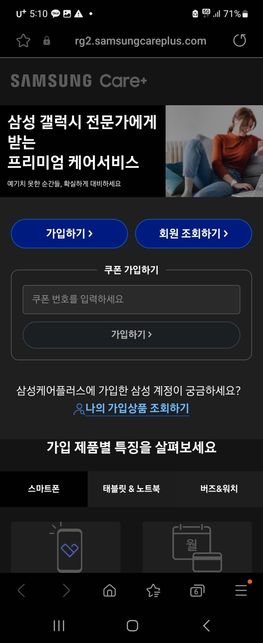 다른 것을 잘못 누르신 분들이 이 과정을 통해 들어오시게 되고 3번째 사진 3번째에 있는 상품 가입하기를 누르시는 경우가 분명 있으실 겁니다. 저도 그랬으니까요.... 근데 4번째 사진의 작은 글씨를 잘 보시면 사은품으로 제공된 '삼성케어플러스 무상 이용권(1년권,6개월 군 등)은 다른 배너로 등록하셔야 한다고 나옵니다. 헷갈리시면 안됩니다.