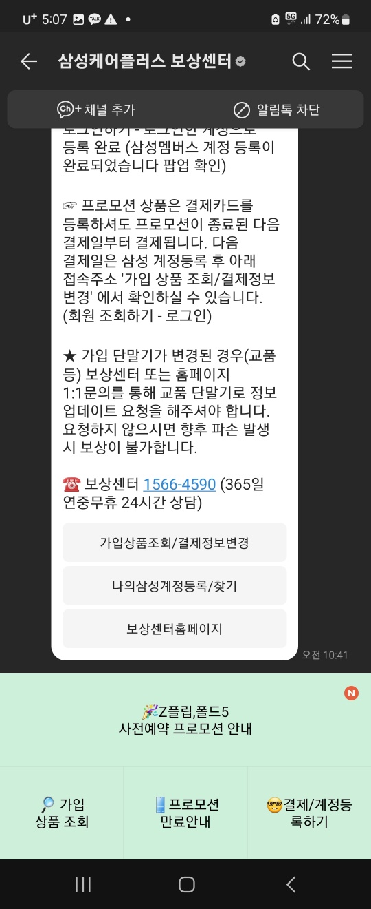 삼성케어플러스 가입상품 안내 카톡이 들어옵니다. 프로모션 기간은 2023년 8월 22일~2024년 8월 21일 1년간 혜택을 받을 수 있습니다. 안내메시지에는 등록하지 않아도 혜택은 동일하게 받을 수 있다고 하지만 혹시나 하는 마음에 가입을 해봅니다. 가입 방법은 삼성계정을 등록 - 시리얼번호 (휴대폰 설정 > 휴대전화정보에서 확인)와 휴대폰 번호 입력 - 삼성계정 로그인하기 - 로그인한 계정으로 등록환료 ( 삼성멤버스 계정 등록이 완료되었습니다. 팝업 확인) 참 간단하죠?