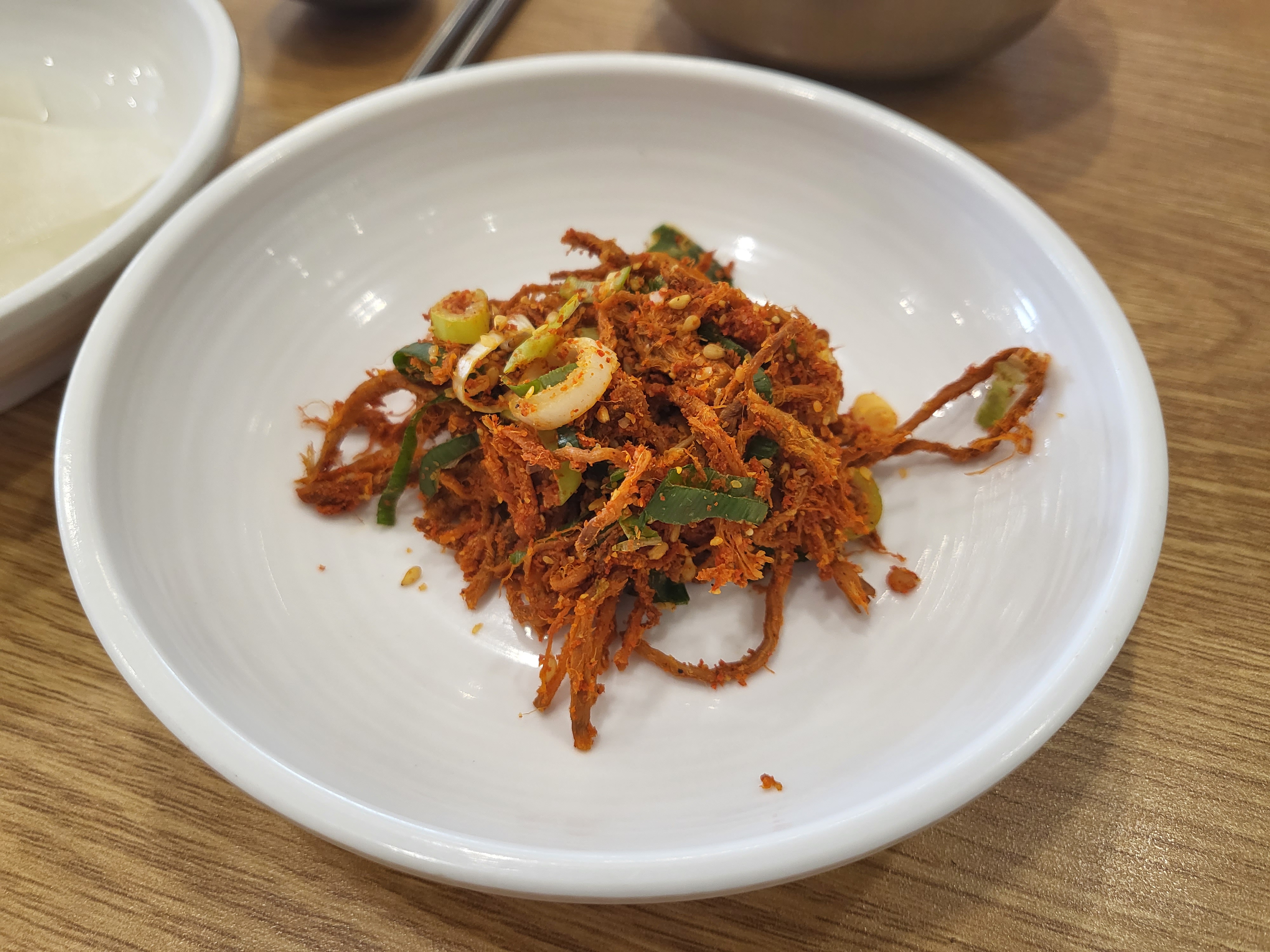 찬은 많이 나오지 않습니다. 원래는 단무지, 하얀무 그리고 고명 이렇게 3가지가 나오는데 이전 오픈하신지 얼마 되지 않아 떡이 추가 되었습니다. 반찬중에 가장 유명한것이 바로 이 고명인데요. 그냥 반찬으로 드시는것 보다는 만두국에 넣어 드시는것이 맛있습니다.