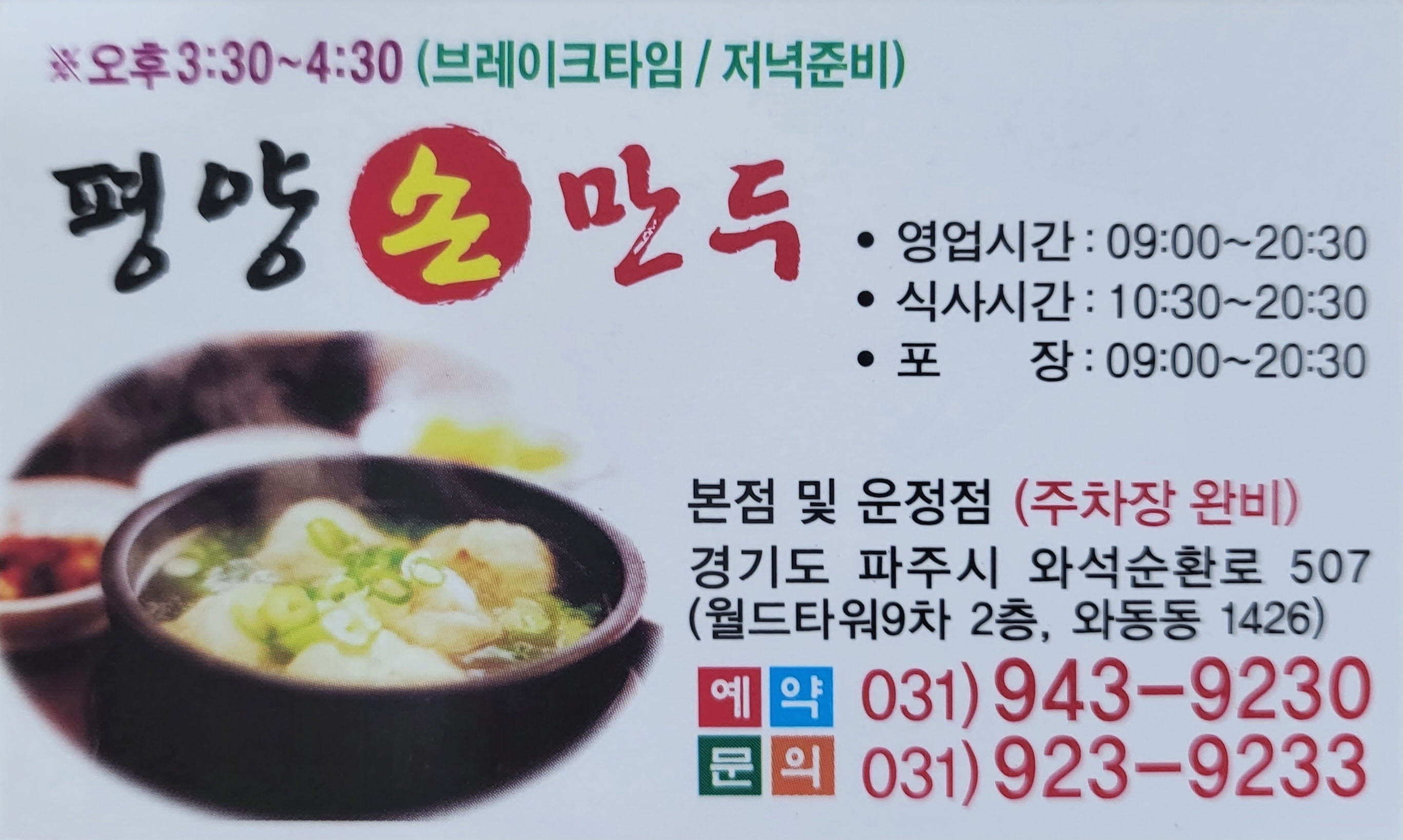 본점 및 운정점은 09 : 00 ~ 20 : 30분까지 인데요 식사시간이 따로 있네요. 식사시간은 10 : 30분 ~ 20 : 30분까지 입니다. 그리고 브레이크 타임은 3 : 30분 부터 4시 40분까지이니 착오 없으셨으면 좋겠습니다.