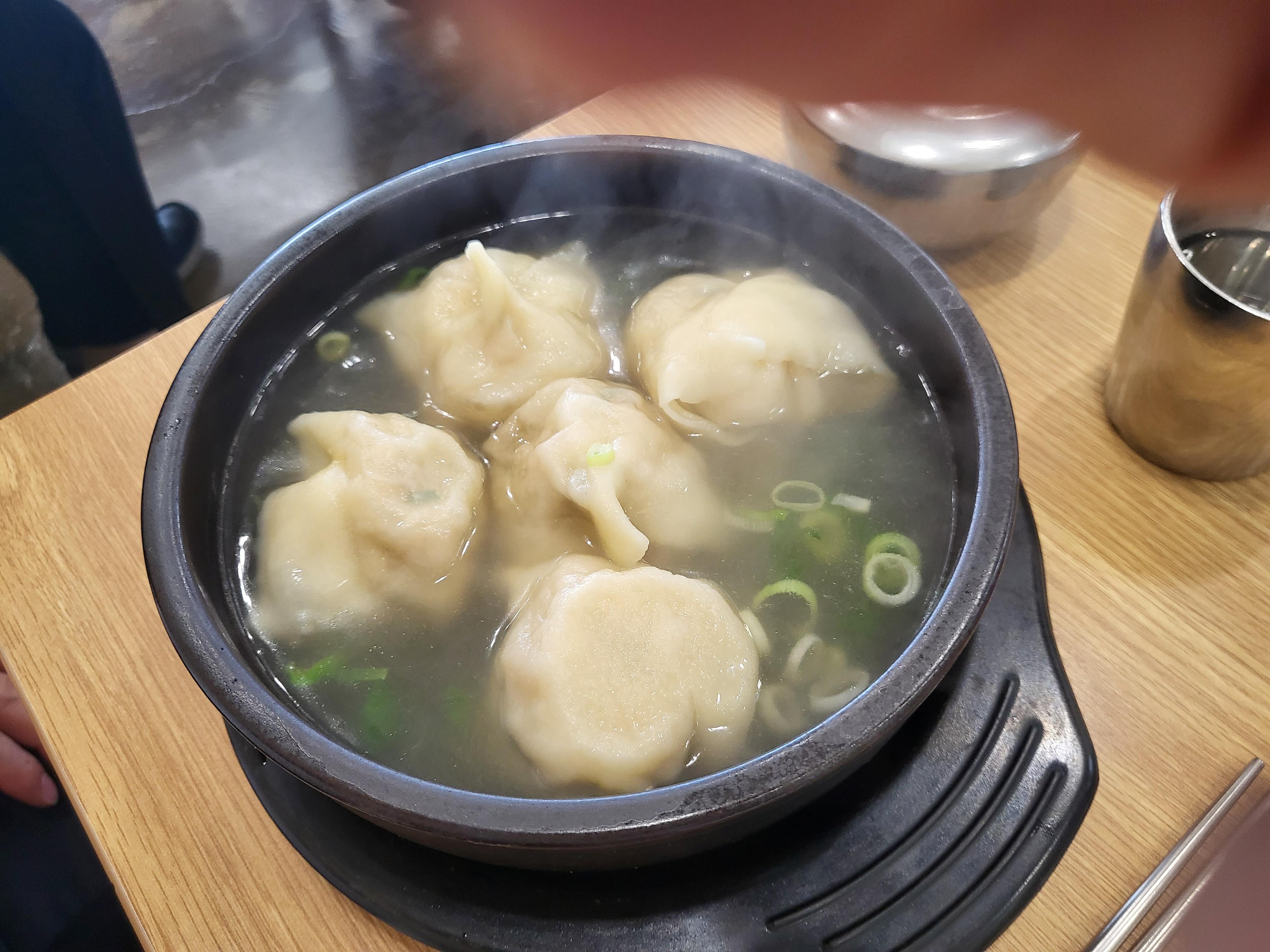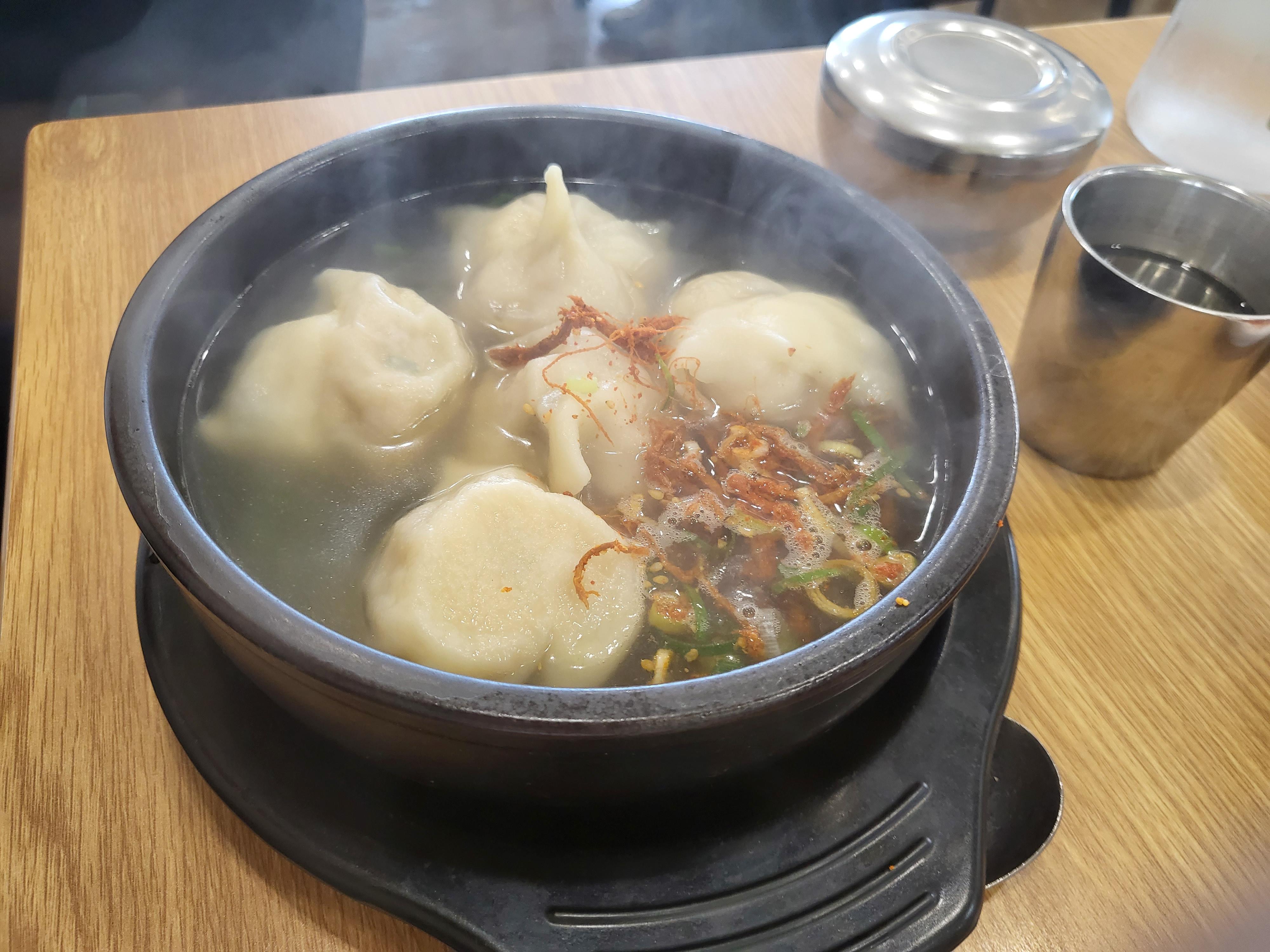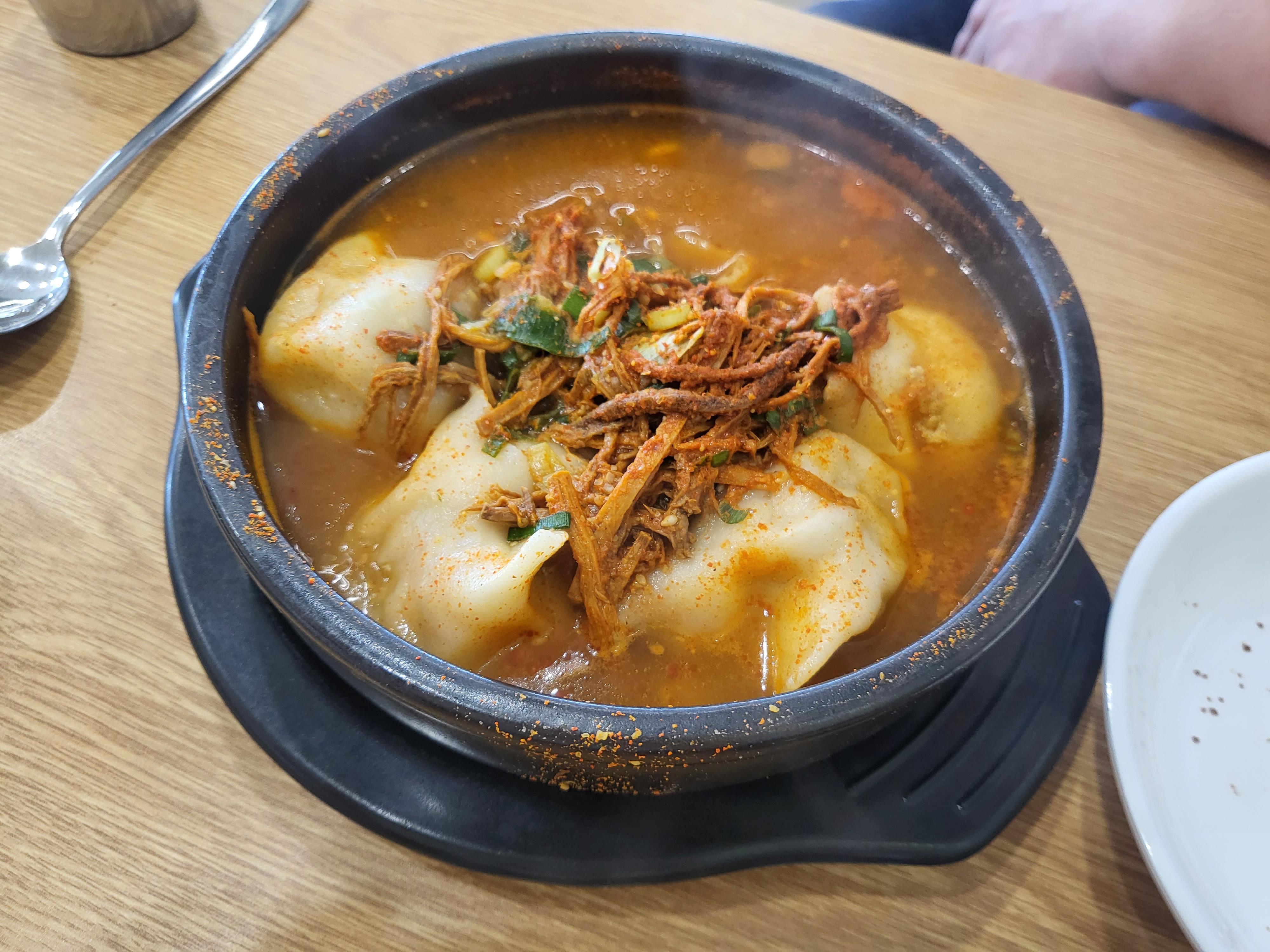 매운맛은 이렇게 처음부터 고명이 넣어져 나옵니다. 사실 짜장이냐 짬뽕이냐 느낌인데 개이적으론 순한맛에 고명을 넣어 드시는게 더 좋을 듯 합니다. 여기서 만두국 드시는 한가지 팁을 드리자면 만두는 주먹만한게 5알이 나옵니다. 그중 1알을 남기셔서 으깨서 밥막아 드시면 정맣 맛있습니다.