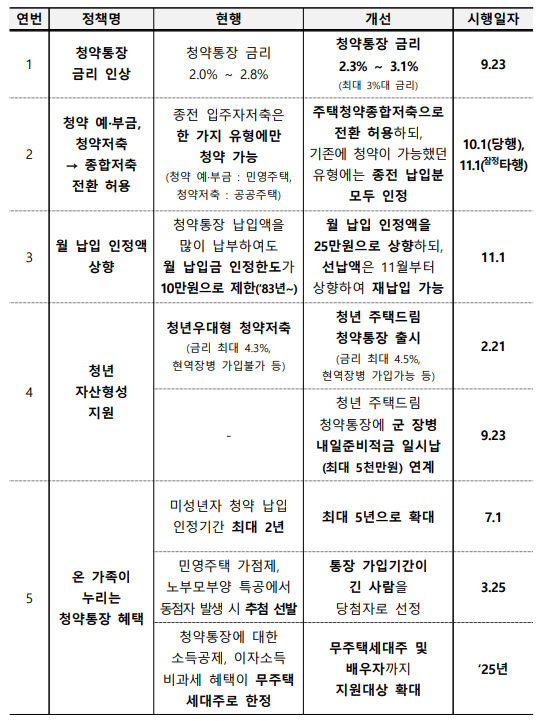 - 자녀 미성년자 청약시 인정되는 납입 기간을 2년에서 5년으로 확대 하였으며, 노부모 특공, 민영주택 가점제에서 동점자 발생시 통장 가입기간이 긴 사람으로 당첨자를 선정하도록 개선하였습니다.