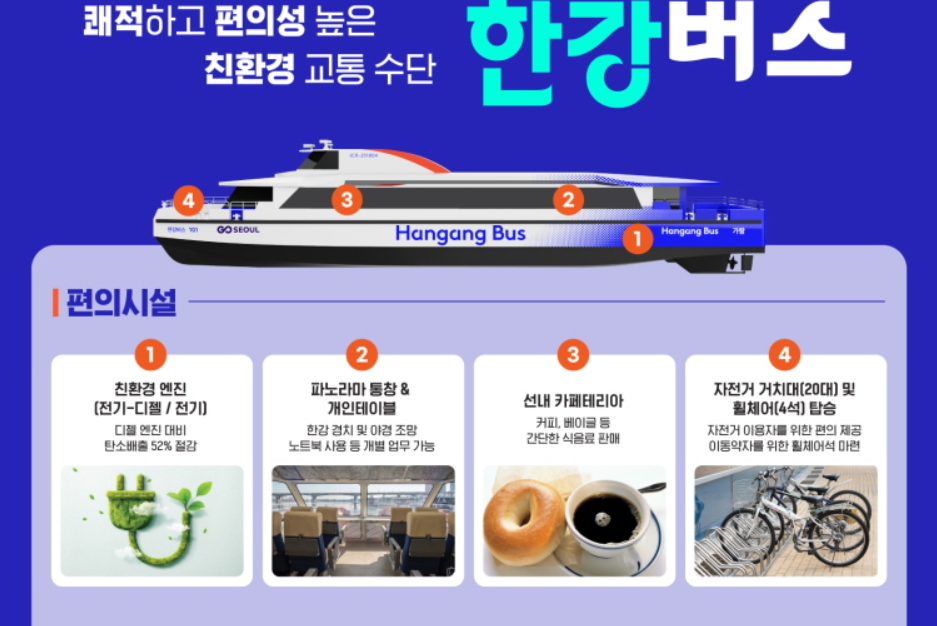 📍한강버스는 서울시의 새로운 친환경 수상교통 프로젝트입니다. 시범운행 중 미리 체험해보시고, 정식 개통 이후 더 편리한 대중교통의 미래를 경험해보세요!