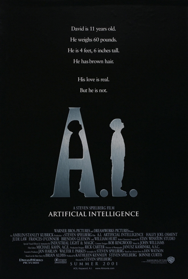 원작은 1969년에 영국의 SF 작가인 브라이언 W. 올디스가 발표한 < 슈퍼토이의 길고 길었던 마지막 여름 >. 스탠리 큐브릭 감독이 원안을 내고 구성하였다. 그러나 자신보다는 스필버그가 잘 맞을 거 같다는 이유로 그에게 영화를 맡겼다. 전체적으로는 스필버그다운 휴먼 드라마가 펼쳐지면서도 군데군데 큐브릭 특유의 냉소적이 감성이 녹아들어 있다. 주연배우로는 < 식스센스 >에서 귀신을 보는 소년 역할로 많은 사람들에게 각인되었던 콜 역할을 맡았던 에일리 조엘 오스먼트가 맡아 연기 하였다. Ai에서는 로봇으로 엄마에게 사랑받고 싶어 하는 데이비드 역을 맡아 연기 하였다. 그의 눈빛이나 두려워하는 연기가 아직도 머릿속에서 가시지 않는다. 그리고 우리나라에서는 어린 시절의 귀여운 외모를 전혀 찾아볼 수 없는 역변한 배우 1위에 뽑히는 불명애를 얻기도 하였다. 주인공인 데이비드에게 도움을 받아 데이비드를 마지막까지 도와주는 애인대행 로봇은 주드로 가 맡았다. 데이비드의 엄마 모니카의 역할은 오스트레일리아의 배우이자 2002년 <에밀리>로 감독에 대뷔한 프랜시스 오코너가 맡았다. 마지막으로 데이비드를 만든 허비교수 역에는 윌리엄 허트가 연기하였다.